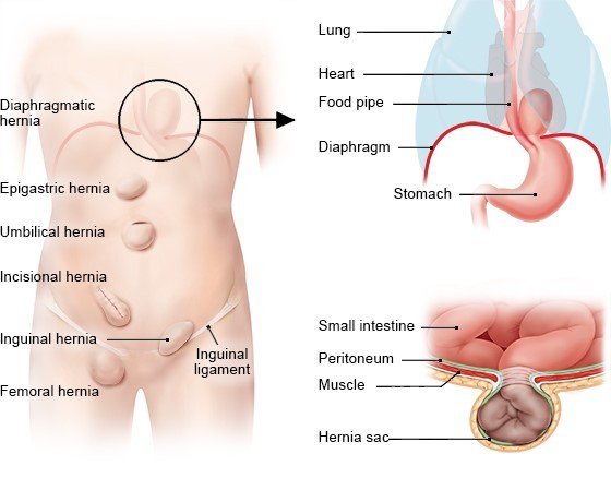 Hernias mostly happen when part of your intestine or the lining of your belly pushes through a weak spot in your belly muscles. This creates a bulge, sometimes called a hernia sac, which you can usually see or feel. Other organs like your stomach can also get pushed into this bulge. Whether it causes trouble or not depends on how big it is and where it is in your body. Symptoms Hernias usually can be feet or seen as bulges. Sometimes they don’t hurt, but they can cause pain, burning, or a pulling feeling, especially when you’re using your muscles. Big hernias can be uncomfortable and upsetting. If a hernia pinches part of your intestine, you might have tummy troubles. In men, a hernia can even make the scrotum swell up. Sudden pain or pain with nausea or vomiting can be a sign of a dangerous blockage. Hernias inside your body are different and can cause heartburn, trouble swallowing, or difficulty breathing. These can be treated with medicine or surgery.